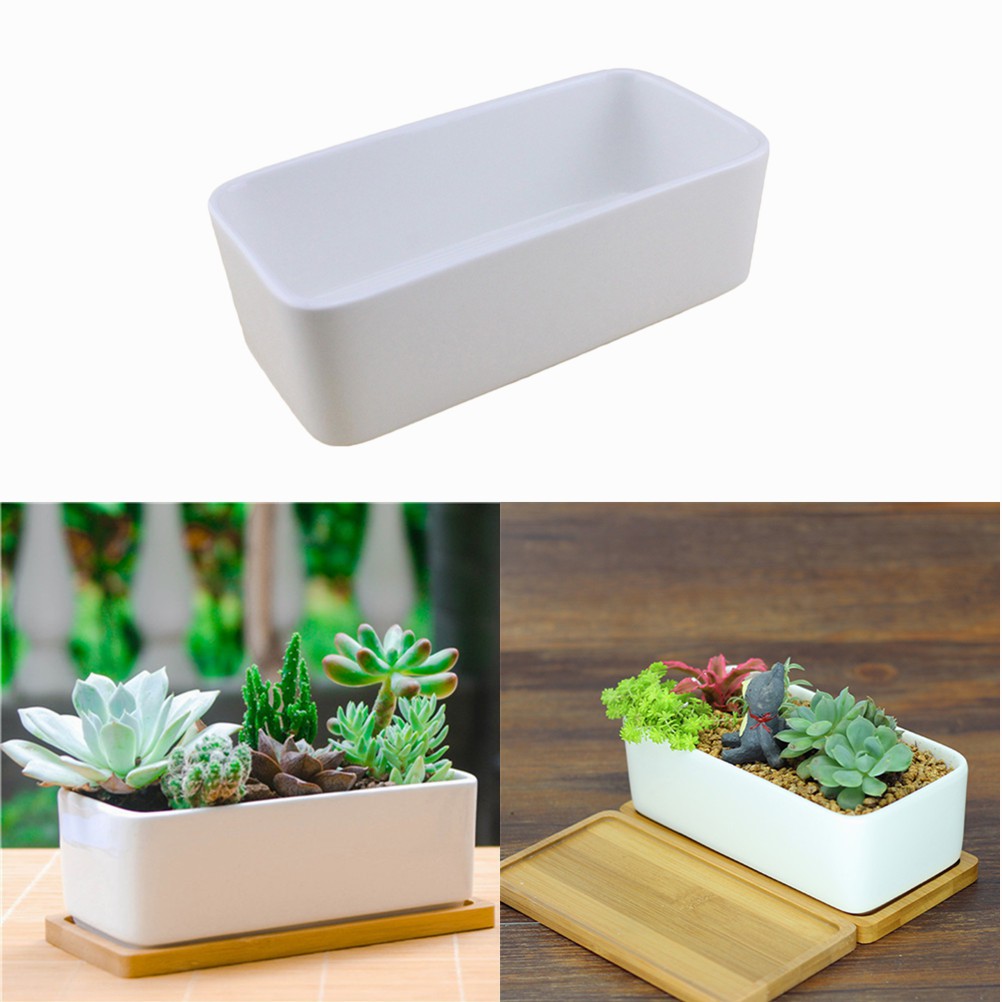 Pot Keramik Warna Putih Persegi Panjang Untuk Dengan Alas Kayu Untuk Tanaman Kecil Kaktus Shopee Indonesia